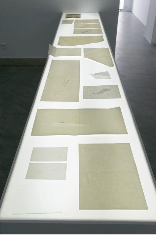 La première séquence de l’exposition présente un alignement de tables lumineuses rectangulaires avec des dessins de différents formats et aux différentes techniques (aquarelle, chaux, poudre, vin rouge…) qui font ressortir la texture des papiers découpés irrégulièrement. « Un travail très intimiste et fragile », où l’on voit des formes, des mains, des taches colorées…, qui laisse le public rêver de ce qui se trame dans la blancheur des feuilles et entrevoir un lien entre les dessins.