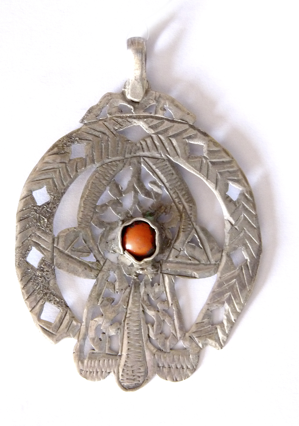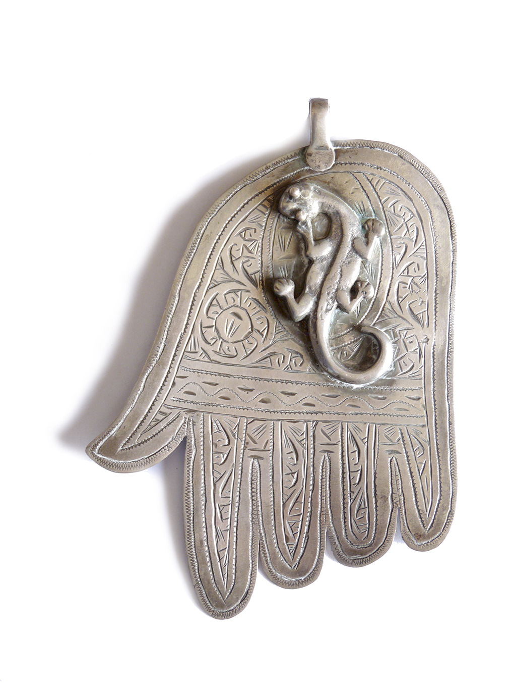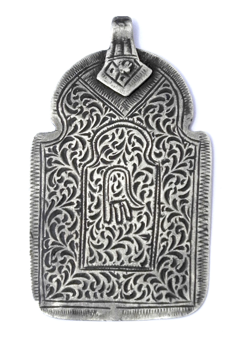 « Leuha » Argent gravé Essaouira La silhouette du bijou est celle d’un mihrab, la main est réintroduite au centre du décor.