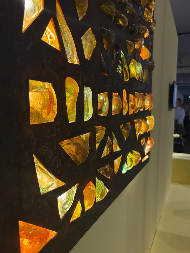 L’artiste propose ici une approche radicalement innovante : remplacer le plomb par des métaux résistants à la chaleur, comme l’acier ou l’inox, pour créer une structure capable d’accueillir le verre en fusion. Ce renversement du processus classique transforme le vitrail en une œuvre volumétrique, où la lumière ne se contente plus de traverser la surface, mais dialogue avec les reliefs, les épaisseurs et les vibrations du verre.